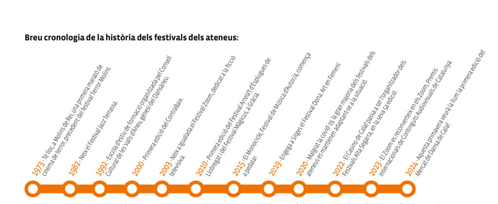 Esdeveniments com el Festival Jazz Terrassa, el Dansàneu, els Premis Zoom o el Terror Molins tenen una llarga trajectòria i són coneguts més enllà de les poblacions que els acullen. El que potser no tothom sap és que al darrere d’aquests i molts altres festivals que es fan cada any hi ha la feina dels ateneus. Arreu del país, centenars de persones vinculades a aquestes entitats dediquen moltes hores a organitzar uns festivals que apropen la cultura als territoris on tenen lloc. Una cultura en el sentit més ampli del terme, perquè, si una cosa caracteritza els festivals muntats pels ateneus, és la varietat, i no només pel que fa a la temàtica, la durada o la seva ubicació en el calendari; n’hi ha de pensats per a un públic familiar, d’altres de més adreçats al jovent, i aquells en què, ben segur, trobarem gent d’edat més avançada… També n’hi ha amb una programació d’artistes professionals i els que fan pujar a l’escenari creadors amateurs o emergents, els que aposten pel talent local i els que compten amb figures internacionals, sense oblidar tampoc els creadors de casa. I diversos són els espais on es desenvolupen els festivals, des dels que tenen lloc de manera íntegra en la seu de l’ateneu organitzador, fins als que executen la majoria d’espectacles al carrer, els que requereixen diferents equipaments del mateix municipi, i els que abracen gran part d’una comarca o diverses poblacions d’una zona geogràfica.