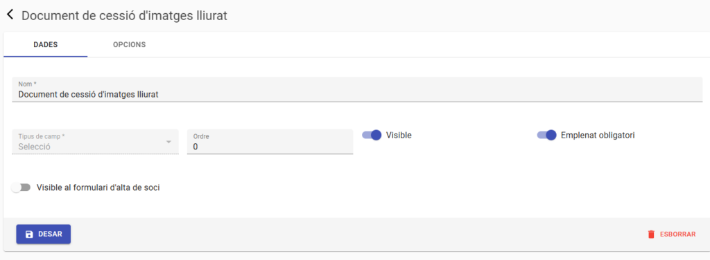 Un cop creat, cal definir-ne les opcions. A la finestra Dades establirem les característiques del camp segons les necessitats. En aquest cas, farem que sigui obligatori indicar si s’ha lliurat o no el document, és a dir, que sempre hi hagi una resposta. En canvi, no ens interessa que aquest camp sigui visible al formulari d’alta de socis.