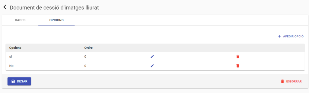 Tot seguit crearem les opcions del camp, afegint el “Sí” i el “No”.
