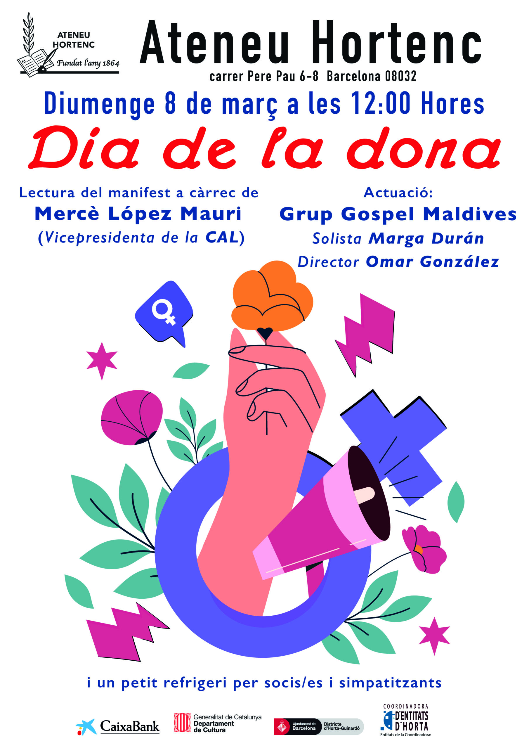 L’Ateneu Hortenc commemorarà el 8M amb la lectura del manifest del Dia de la Dona, l’actuació en directe del Grup de Gospel Maldives i un petit refrigeri per a socis, sòcies i participants.