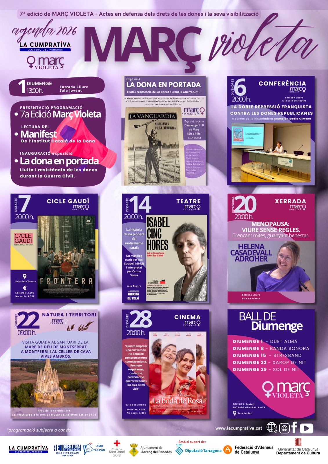 La Cumprativa celebra, a Llorenç del Penedès, una nova edició del Març Violeta, amb una programació que inclou exposició i lectura del manifest, una conferència de la historiadora Asunción Badia Gimeno, el monòleg Isabel cinc hores interpretat per Carme Sansa, una xerrada sobre menopausa i la projecció de la pel·lícula La boda de Rosa.