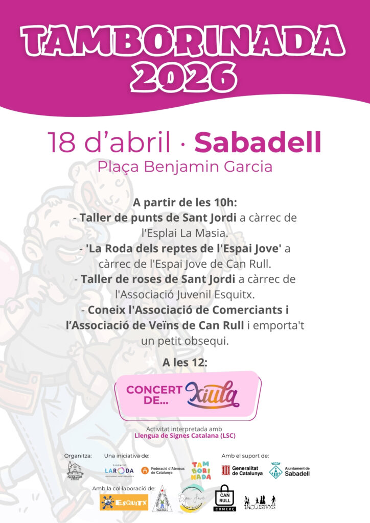 El 18 d’abril tindrà lloc, a la plaça Benjamin Garcia de Sabadell, la primera TAMBORINADA d’aquest any 2026 de la Fundació La Roda. Serà amb el suport de l’entitat Esplai La Masia i comptarà amb el següent programa d’activitats adreçades al públic familiar i relacionades amb la temàtica de Sant Jordi.