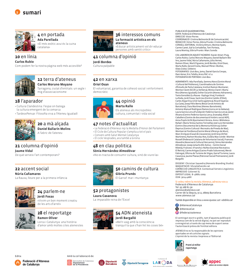 El secretari General del Departament de Cultura i Mitjans de Comunicació, Lluís Noguera, ens explica que és bo que els ajuntament tinguin en compte les entitats amb experiència. El nostre gestor, Roger Santiago, ens explica com afecta l’IVA a les entitats no lucratives. La nostra advocada, la Patrícia Julià, ens resol què és la Llei orgànica de protecció de dades. Els líders dels partits polítics catalans adrecen sengles cartes als ateneus, i acabem la revista amb les entrevistes a la Carme García, responsable de Cultura Popular i Tradicional de la Diputació de Barcelona, i l’actriu Rosa Gàmiz.