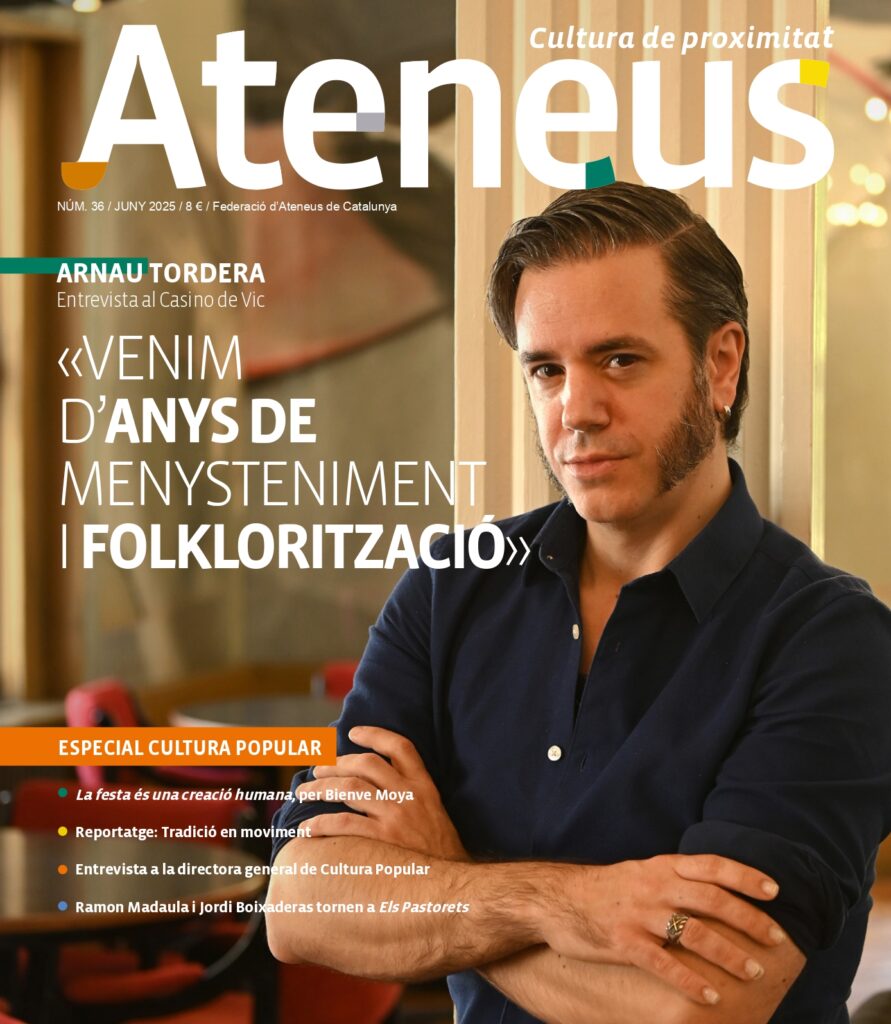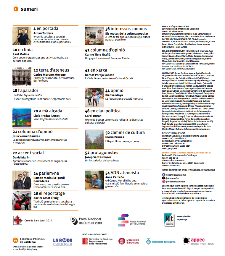 Obrim revista amb la Núria Llorach, gestora cultural i directora de Culturae. Amb ella tenim una interessant conversa sobre gestió cultural ateneística. L’Enric Montseny ens acosta a què es pot fer per millorar l’eficiència energètica d’una entitat. Des de Girona, el seu alcalde, Carles Puigdemont, explica que no s’imagina un país sobrevivint sense una cultura popular forta. I finalment, el Jaume Bernadet i Munné, actor ens parla d’Els Comediants a la contraportada.